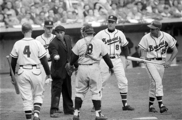 - Game Four is remembered for Nippy Jones’ controversial hit-batsman call when Jones showed umpire Augie Donatelli a shoe polish smudge on the ball he claimed hit him on the foot and was awarded first base. The play was instrumental in the Braves’ eventual win in 10 innings, with Eddie Mathews hitting a walk-off homer.