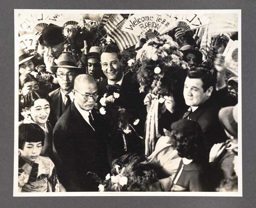 And what a reception the American “ambassadors of goodwill” received! It was reported that over 500,000 Japanese lined the streets of Tokyo for the welcoming parade, all hoping to catch a glimpse of the great Bambino. Try to picture the scene with the always-animated Babe cheerfully acknowledging the warm reception by waving Japanese and American flags, while flashing the huge Babe Ruth grin as he rode through the massive sea of adoring fans.