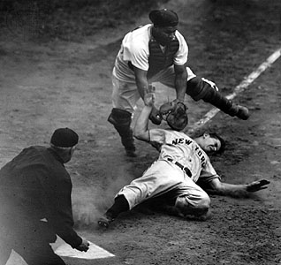 I made this quote up for the featured photo below, but it pretty well sums up the defensive prowess of the great catcher, Roy Campanella. Judging by the grimace on the face of the Giants base runner, Jack Lohrke, I have a hunch he regretted trying to score against Campanella. I’d say Campy literally “flattened” him. He was out by the old “country mile!”