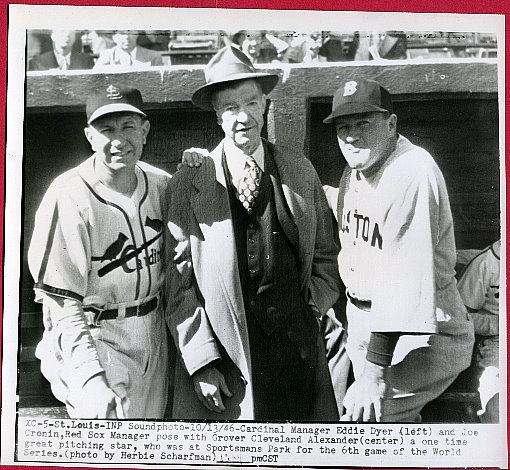 The Series went seven games. The deciding contest was played in Sportsman Park in St. Louis. In the top of the eighth inning with the Cards leading 3-1, Red Sox center fielder Dominic DiMaggio doubled home two runs, tying the score. However, DiMaggio was injured on the play and was replaced by pinch-runner Leon Culberson. Significantly, Culberson also replaced DiMaggio in center field in the home half of the inning. DiMaggio was a great outfielder, one of the best of his generation. Culberson not so much.
