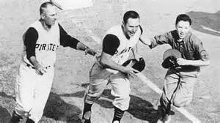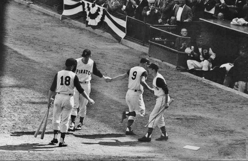 “Gino Cimoli led off the Pittsburgh eighth with a pinch-single and Bill Virdon hit a sharp grounder toward Yankees’ shortstop, Tony Kubek. After the speeding ball took a bad hop and struck Kubek in the throat (resulting in a single), Joe DeMaestri was summoned to replace him as both Pirates remained on base. Dick Groat followed with another single cutting the lead to 7-5 and Roberto Clemente kept the rally going with an infield hit that scored Virdon and advanced Groat to third. Now trailing 7-6, Pittsburgh had two runners on base and Hal Smith at the plate. Smith, who entered the game in the top of the eighth after Pirates catcher Smoky Burgess had left for a pinch-runner in the previous inning, sent shock waves through the Pittsburgh crowd by blasting a timely home run over the left-field wall. The Pirates had put a 5-spot on the board and now led 9-7”