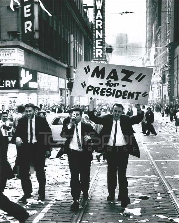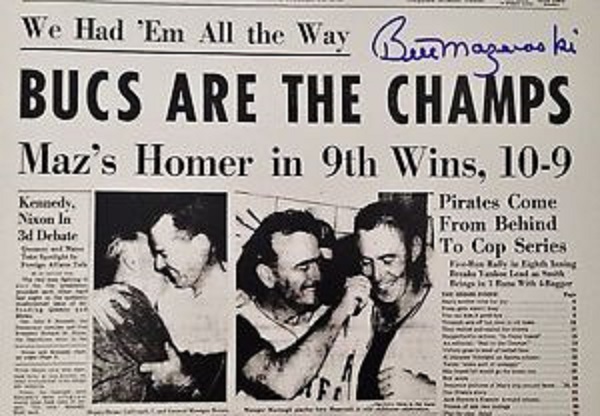 Ralph Terry, who had gotten the final out in the Pirates’ eighth, returned to the mound in the bottom of the ninth to finish the job. The first man he faced was Bill Mazeroski. With a count of one ball and no strikes, the Pirates’ second baseman smashed a historical long drive over the wall in left ending the contest and crowning the National League as champions. As the Pirates erupted in a wild celebration, the Yankees stood in disbelief knowing that they had clearly dominated the series, but were unable to finish the task. The improbable champions were outscored, 55-27, and out-hit, 91-60, but in the end the home team prevailed. Years later, Mickey Mantle was quoted as saying that losing the 1960 series was the biggest disappointment of his career. For Bill Mazeroski, it was the highlight.”