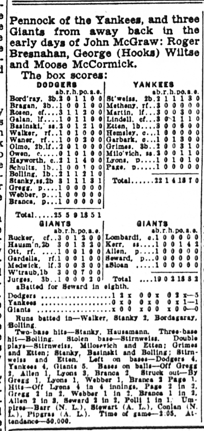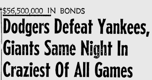 The game consisted of six innings to raise money for war bonds. The charity contest ended with the “highly unusual” final score of Dodgers 5, Yankees 1, and Giants 0.