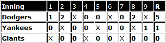(D = Dodgers, Y = Yankees, G = Giants; In each box the first letter was for the top half of the inning; the second letter for the bottom of the inning).
