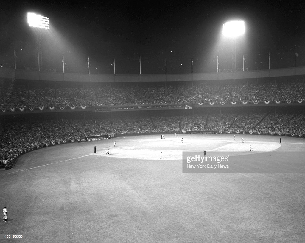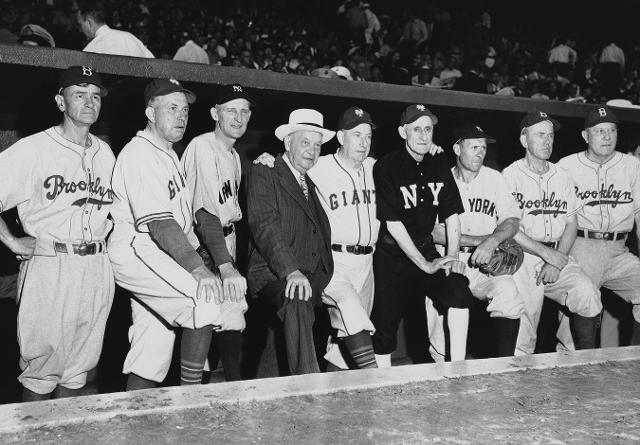 Before the game, the clown prince of baseball, Al Schacht, entertained the fans. Milton Berle led 6musical numbers played by the Manhattan Beach United States Coast Guard band. Former New York City Mayor James J. Walker introduced a group of New York “Old-Timers,” including Zack Wheat, Nap Rucker, Otto Miller, Wally Schang, Bill Dickey, Herb Pennock, Roger Bresnahan, Hooks Wiltse, and Moose McCormick. Babe Ruth had been scheduled to appear, but he did not show.