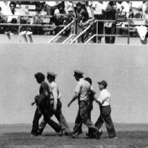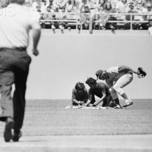 At Dodger Stadium on April 25, in the Bicentennial year 1976, two protesters ran into left-center field and tried to set fire to an American flag. Rick Monday, the Cubs’ center fielder, had been tossing a practice ball with left fielder Jose Cardinal. After Steve Stone of the Cubs threw a pitch that made Ted Sizemore pop out, Monday dashed over and rescued the flag before it could be set afire. Monday ran through the infield with the flag and handed it over to Dodgers pitcher Doug Rau. Monday had served a commitment with the Marine Corps Reserve as part of his ROTC obligation after leaving Arizona State.