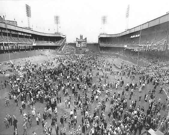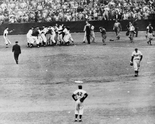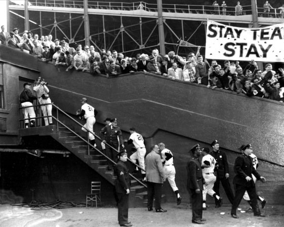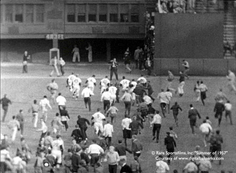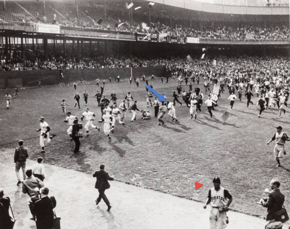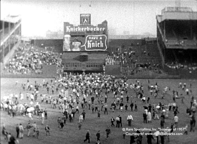 The Giants’ final three outs in the bottom of the ninth took only 12 pitches from Pirates’ starter Bob Friend. Don Mueller flied out to right on the second pitch; Willie Mays grounded out to shortstop Dick Groat on the fourth pitch. And then Dusty Rhodes took the count to 3-2 before also grounding out to Groat. Immediately after the final out was recorded, thousands of fans swarmed on to the field, stripping the park of anything that could be removed as a souvenir: home plate, the bases, the pitching rubber, patches of outfield grass, infield dirt, signs, telephones, seats, outfield padding, even the bronze plaque on the memorial to Eddie Grant, the Giant hero who was killed in World War IUnder a banner proclaiming, “Stay Team Stay,” a chant started up, demanding owner Horace Stoneham’s head in a noose. Sensing that the scene was not safe and could easily get out of hand, the players immediately fled for their lives to the safety of the club house in center field.