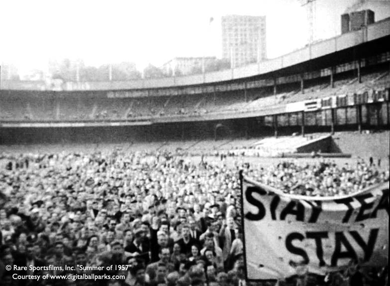 Thanks to my Old-Time baseball Photos partner Ron for calling my attention to the fact that on September 29, 1957, just four days after the Dodgers played their last game in Ebbets Field, the Giants played their last game in the Polo Grounds. Like the last game at Ebbets Field, this one was also against the Pirates, and resulted in a 9-0 Giant loss. Thus ended the National League presence in New York with the departure for the West Coast of two of its premier franchises, the Brooklyn Dodgers and the New York Giants..