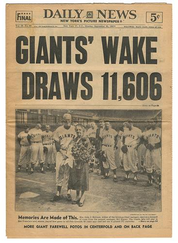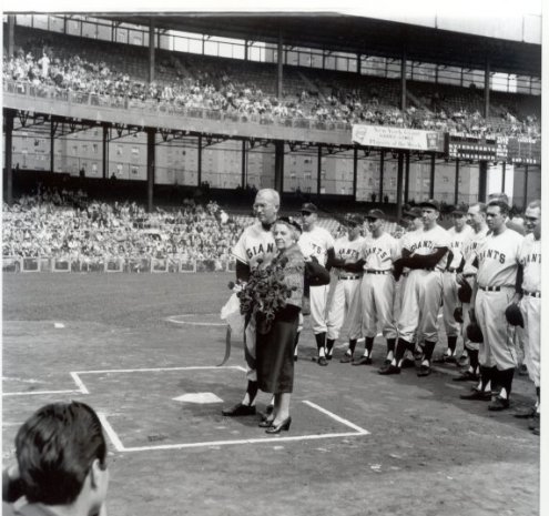 On hand for the final game were two of the original Giants from the Glory Days of 1911-13: Rube Marquard and “Laughing Larry” Doyle. The guest of honor was Blanche McGraw, widow of legendary Giants’ manager John McGraw. It was arranged for Blanche to be the last fan to leave the stadium.