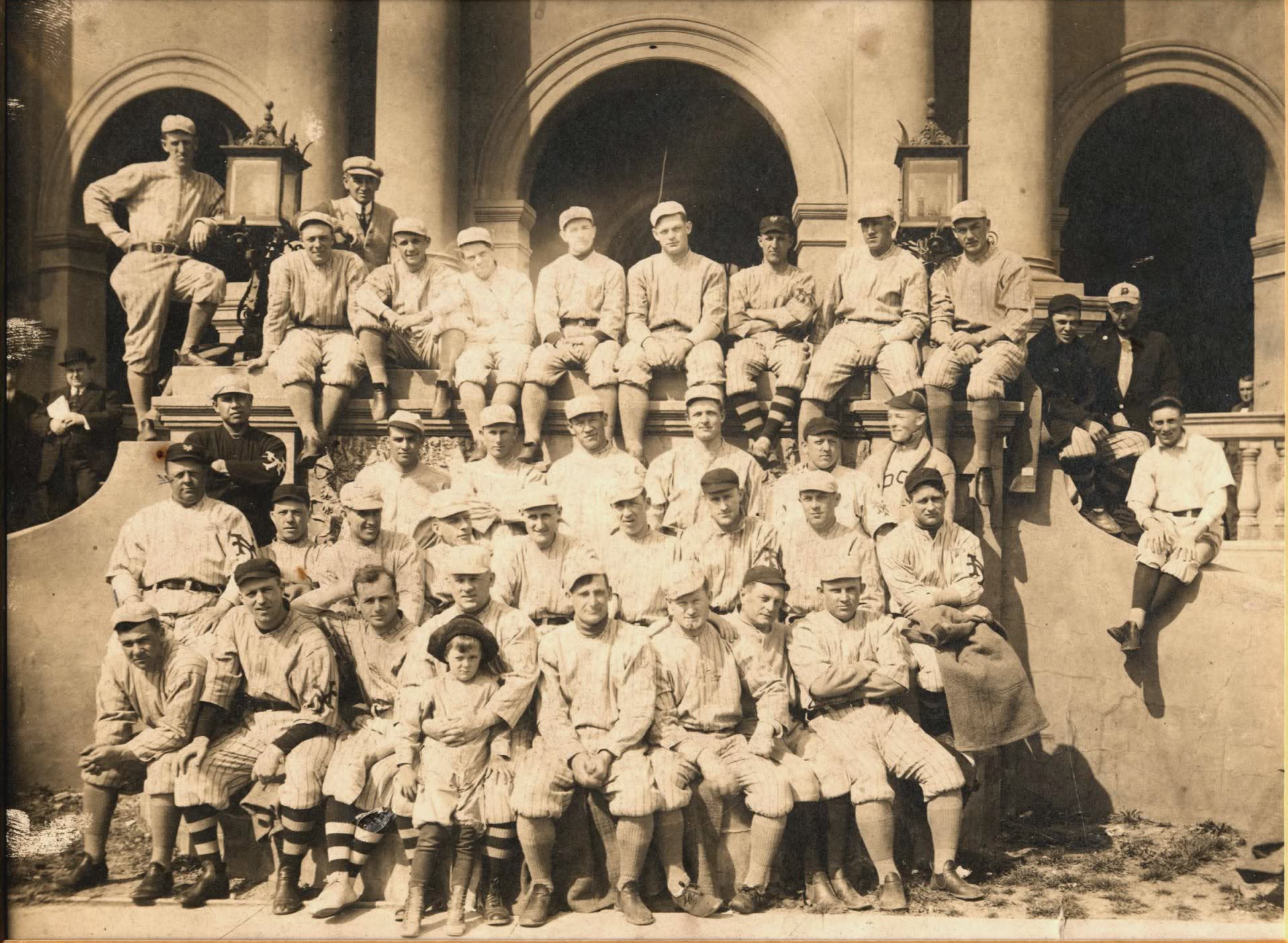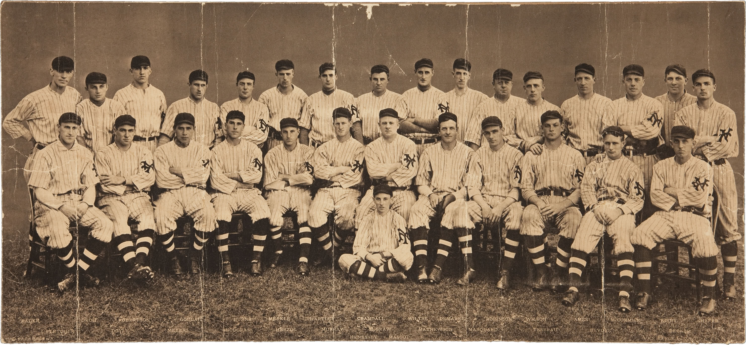 Front Row, L-R: Art Fletcher, “Laughing Larry” Doyle, Chief Meyers, Fred Snodgrass, Buck Herzog, Red Murray, Mascot Hennessey, John McGraw, Christy Mathewson, Rube Marquard, Jeff Tesreau, Josh Devore, Beals Becker.