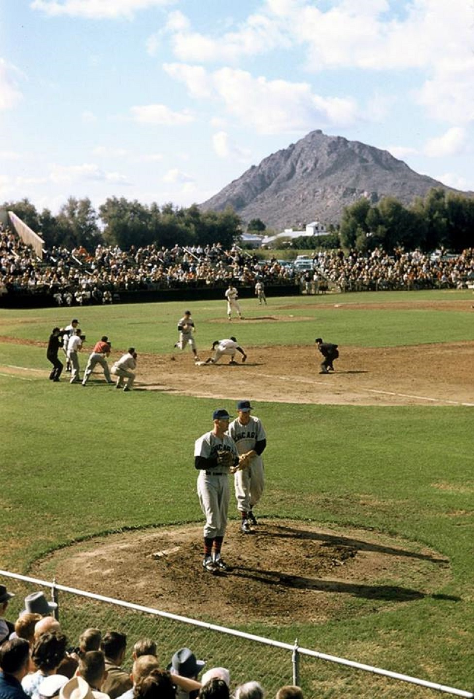 In my recent photo of the Cubs at spring training, reader Karl Isenberger noted that the Cub players in the bull pen wore uniforms similar to the Cub batboy in the iconic Norman Rockwell painting, “The Dugout.” With this information, Karl was able to determine that this spring training photo was taken on March 10,1956. It was the very first game played at Scottsdale Stadium, between the home Orioles and the visiting Cubs. This was last year the Cubs wore this uniform.