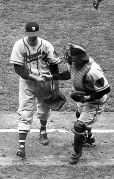 In the featured photo above, we see one of my World Series favorites. This great photo is from the second inning of the sixth and final game, won by the Indians 4-3. That’s Braves’ first baseman Earl Torgeson (whose daughter Christine is one of our readers) “laying out” across the Indians’ dugout. He’s attempting to catch a foul ball hit by starting pitcher Bob Lemon, as Indians’ players in the dugout look on. A fan is also visible with outstretched hands making a futile attempt to snare it. If you look closely, you’ll see an arrow pointing out where the ball is. The umpire is Bill Stewart.