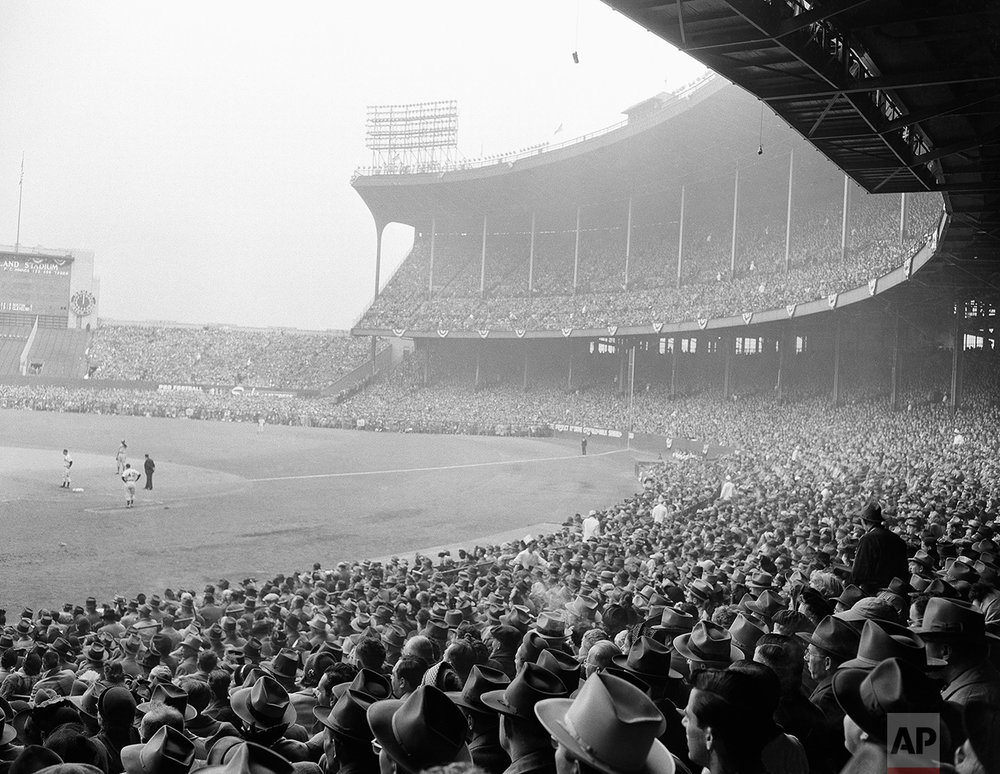 The photo gives us a real “slice of Americana” during the 1940s. It’s interesting to see how fans dressed for games at that time. Quite a contrast with today’s casual attire. When was the last time you saw someone in a suit and tie at a ball game? Or guys smoking cigars in the stands? File this one under “days gone by.”