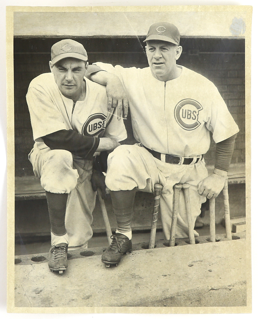 Cub player relax on top of their dugout: Charlie Grimm, Gabby Hartnett, Ken O’Dea, Billy Herman, Red Corriden, Frank Demaree, 1937