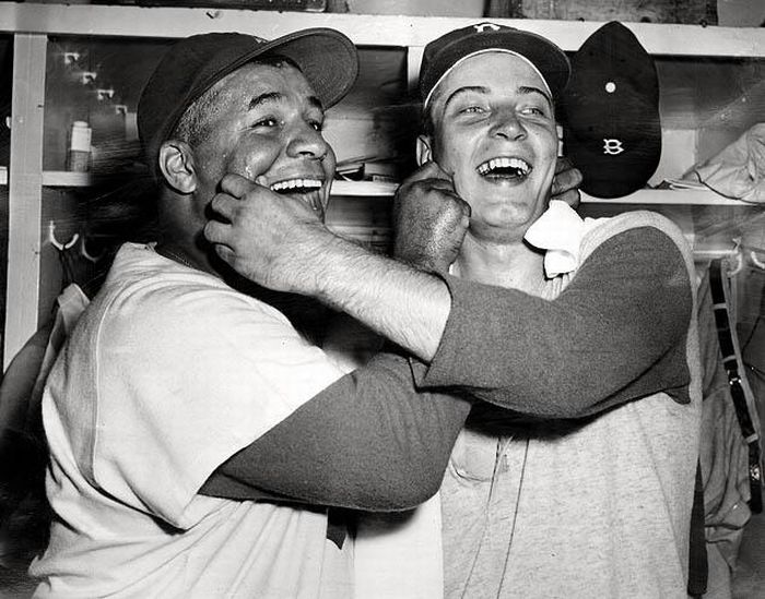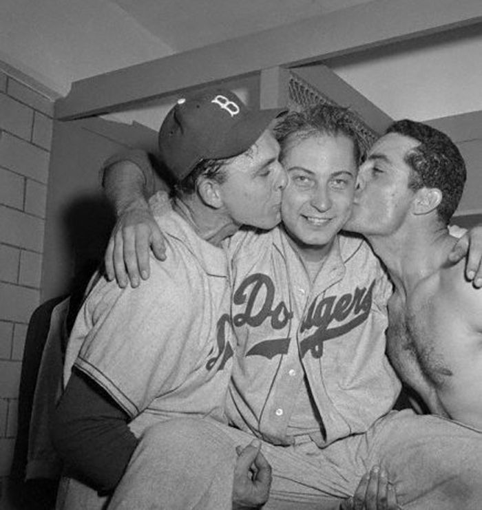 heroics won Game Four. But, as I mentioned, the celebration was short-lived. The Yankees eventually won the 1947 World Series in seven games. In today’s photo above, we see the normally quiet and reserved Joe DiMaggio in a very uncharacteristic moment. He’s about to plant a “smooch” on winning pitcher Frank Shea. Almost hard to believe! Other photos in the gallery depict Dizzy Dean with a lampshade on his head as he hugs Frankie Frisch in 1934; Phil Rizutto planting a kiss on Billy Martin in 1952; and Duke Snider, Don Newcombe, and Johnny Podres getting a champagne shower in 1955.