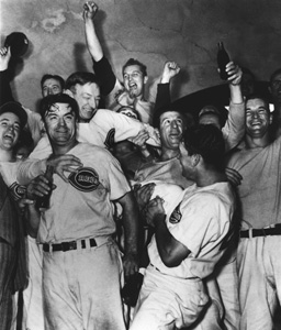 Today in Part III of this series, I’ll do away with the “Defeat” and instead just concentrate on the “Thrill.” I’ve always enjoyed looking at raucous clubhouse celebration scenes after World Series victories. Even more so from the old days – before the advent of the big bucks – when baseball was played more for the love of the game than anything else.