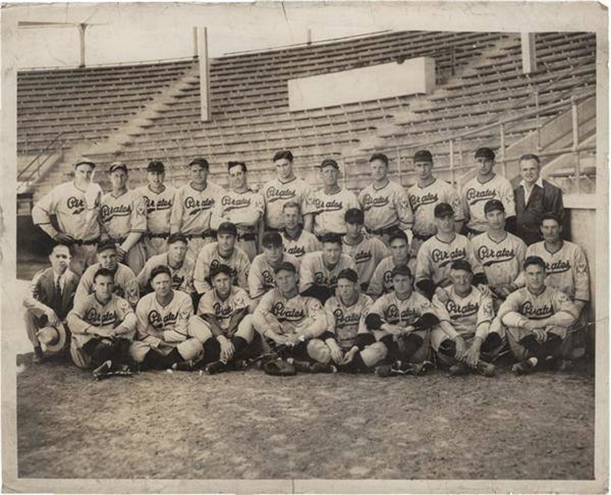 Top row, L-R: Pie Traynor, Ray Berres, Unknown (might be Chuck Klein), Heine Manush, Johnny Rizzo, Maurice Van Robays (?), Woody Jensen, Rip Sewell, Bill Swift, Joe Bowman, unknown civilian. Middle, L-R: Unknown civilian, Mace Brown, Bob Elliott, Fern Bell (?), Ray Mueller, Russ Bauers, Cy Blanton, Bill Clemsen, Waner, Bill Klinger, Unknown, Gus Suhr. Front, L-R: Lee Handley, Red Juelich, Jim Tobin, George Susce, Pep Young, Waner, Honus Wagner, Arky Vaughan.