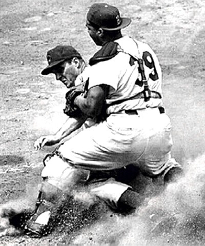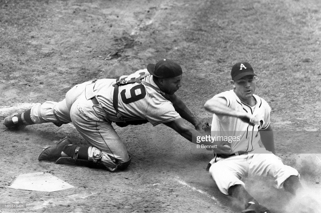 I made this quote up for the featured photo above…but it pretty well sums up the defensive prowess of the great catcher, Roy Campanella. Judging by the grimace on the face of the Giant baserunner, Jack Lohrke, I have a hunch he regretted trying to score against Campanella. I’d say Campy literally “flattened” him, and he was out by the old “country mile!” If the third base coach sent him on the play, it was definitely a bad decision!