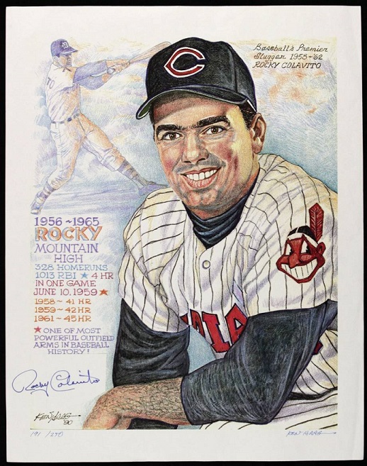 Colavito played 14 seasons in the major leagues (1955-68). While he is best known for his years with the Indians, he also played for the Tigers, Athletics, White Sox, Dodgers, and Yankees. Over his career, he hit .266, with 374 home runs, 1159 RBIs. 971 runs, 1,730 hits, 283 doubles, and 21 triples. As an outfielder, he recorded 3323 putouts, 123 assists, 26 double plays, and a .980 fielding percentage. He was a nine-time All-Star and led the American League in home runs (42) in 1959, RBIs (108) in 1965, and slugging (.620) in 1958. Colavito was the fifth player in American League history to have 11 consecutive 20-home run seasons (1956–66), hitting over 40 home runs three times and 100 runs batted in six times during that span. Rocky also hit 30-plus homers seven times.