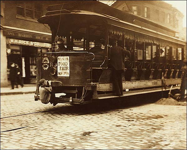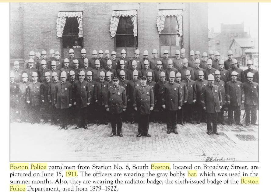 We realized it was not Fenway, which has a brick façade, so has to be Huntington Avenue Grounds. Next we looked at the trolleys. A Google search revealed one from 1909 almost identical to the ones in the photo. We then checked out the cop. We could see a greyish helmet and a badge. A search yielded cops from 1910-11 wearing the exact uniform. The helmet was described as “the grey summer bobby helmet.” The badge was called a “radiator patch.”