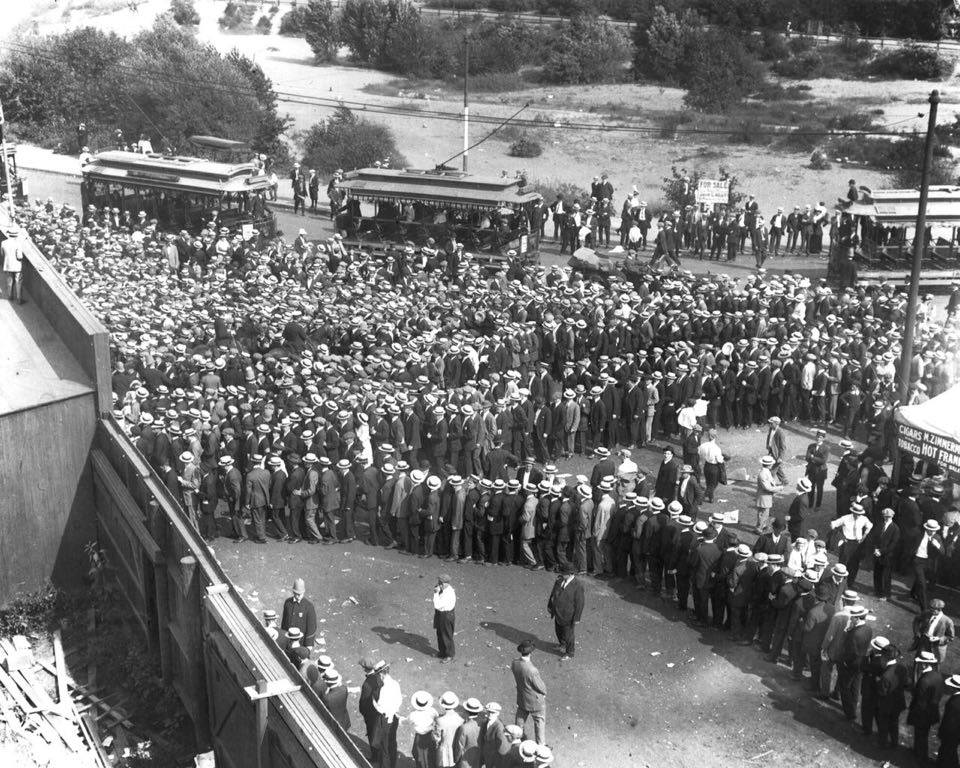 Elmer thought it was from Fenway Park, and figured it was fans waiting to get into a game. Our crack baseball researcher Don Stokes and I put our heads together. At first glance we didn’t see anything definitive, but there were some clues. Be sure to click on the photo to see it in much greater detail.