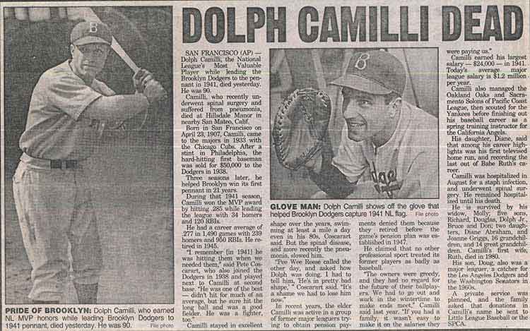 Dolph’s best year was his 1941 MVP year when he hit .285 and led the league in home runs (34) and RBIs (120), as the Dodgers won their first National League pennant since 1920. The following year, 1942, he finished second in home runs (26) and RBIs (109), breaking Zack Wheat’s Dodger career home run record (131). After a trade to the Dodgers’ hated rivals, Giants, in July 1943, Camilli refused to report and instead managed the Oakland Oaks for the next two seasons.