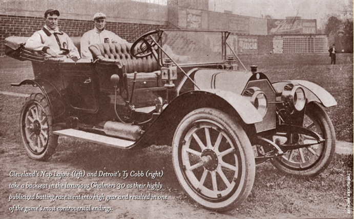 With two games left in the 1910 season, Ty Cobb was leading Nap Lajoie in the batting race .385 to .376. At stake was a new Chalmers Model 30 awarded to the winner. Lajoie and the Indians were at Sportsman’s Park for a double-header against the Browns to close out the season. Meanwhile, Cobb skipped the Tigers’ final two contests to protect his average, claiming an eye ailment.