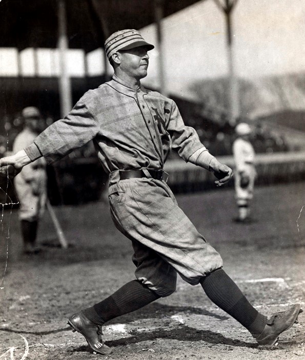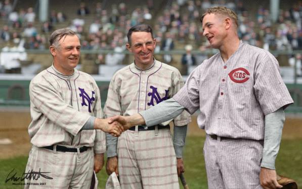 In the featured photo above, we see a beautiful colorization by Chris Whitehouse of John McGraw with Buck Herzog and the great Christy Mathewson sporting the unsightly checkered uniforms that fortunately lasted only one season.