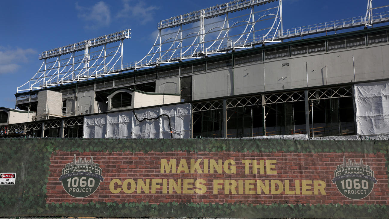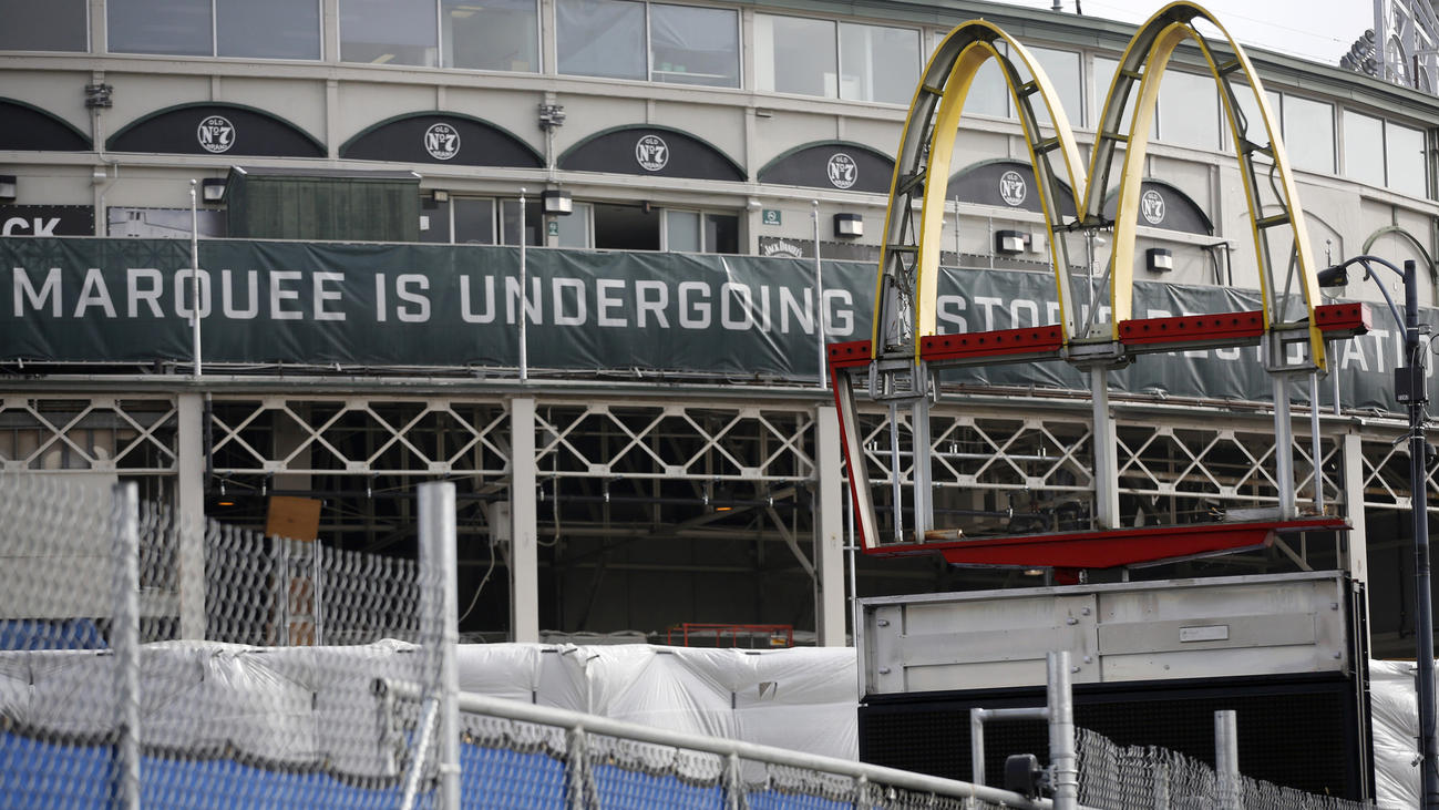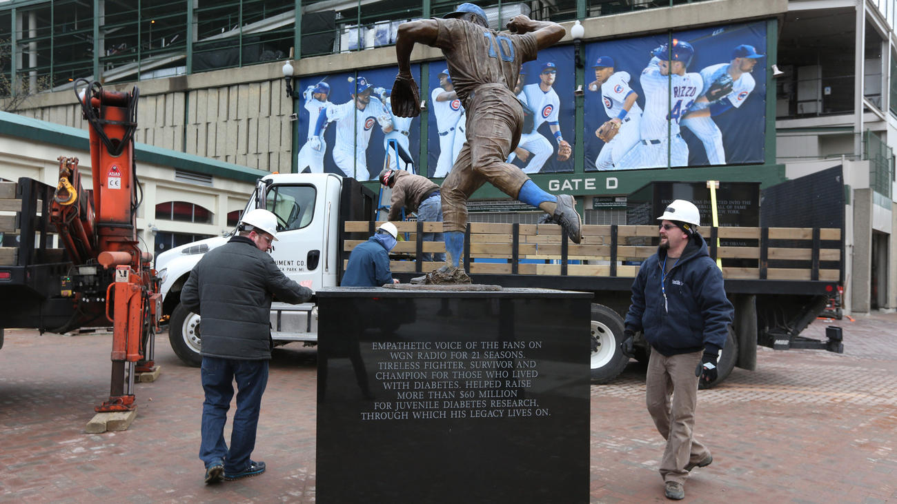 Two notable exceptions were when the Cubs painted the marquee purple in 2010 when Wrigley hosted the Northwestern-Illinois football game, and in 2014 when the Cubs painted it green to mark the ballpark’s 100th anniversary.) On Monday, the statues of Harry Caray, Ron Santo and Billy Williams were returned to their homes; Santo and Williams outside Gate D at Sheffield and Addison, with Caray outside the Budweiser Bleacher Gate entrance, at Waveland and Sheffield. On Friday, the Ernie Banks statue is expected to return once the Gate F is cleared following the marquee’s installation.