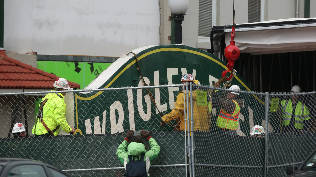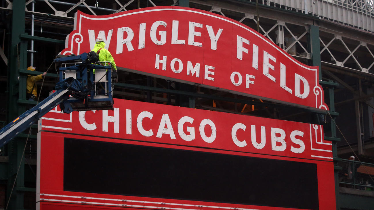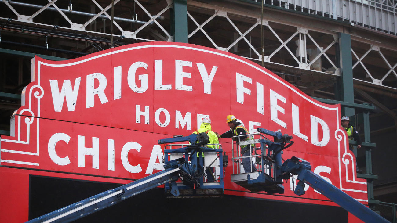 With the Cubs Opening Day, 2016 at Wrigley Field scheduled for tonight, the rush has been on to complete many of the Wrigley Field renovations. Nothing was more important than returning the historic marquee on the facade at the corner of Clark and Addison to its proper place before the game.