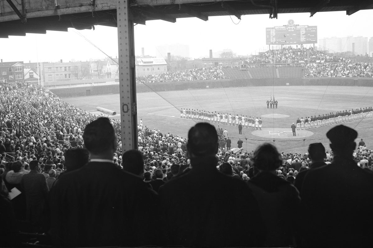 Of course, for us fans of baseball history, even this marquee replacement assumes great importance! Especially when we learn that it was originally installed back in 1934. So we can’t let this occasion pass without notice, can we? In the beautiful photo below, we see the marquee as it looked after its installation. The marquee says “National League Champions.” As we know, the words “Cubs” and “Champions” aren’t used in the same sentence very often, so this is either 1935, 1938 or 1945. Maybe someone can look at the car in the photo and give us the exact year.Actually, I’m thinking now it’s Opening Day, 1946.